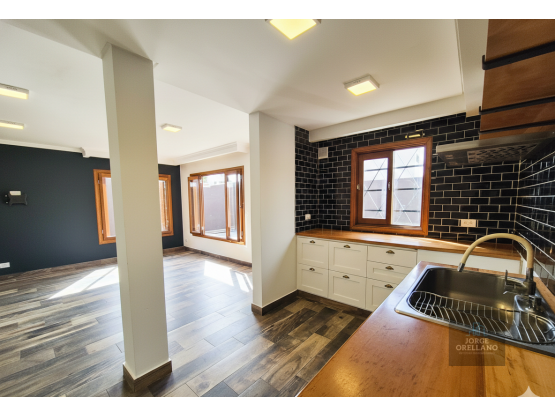 * Amplio y luminoso living con cocina comedor intergados, con funcionales muebles de cocina y con ventana y puerta con salida al importante patio de atrás;